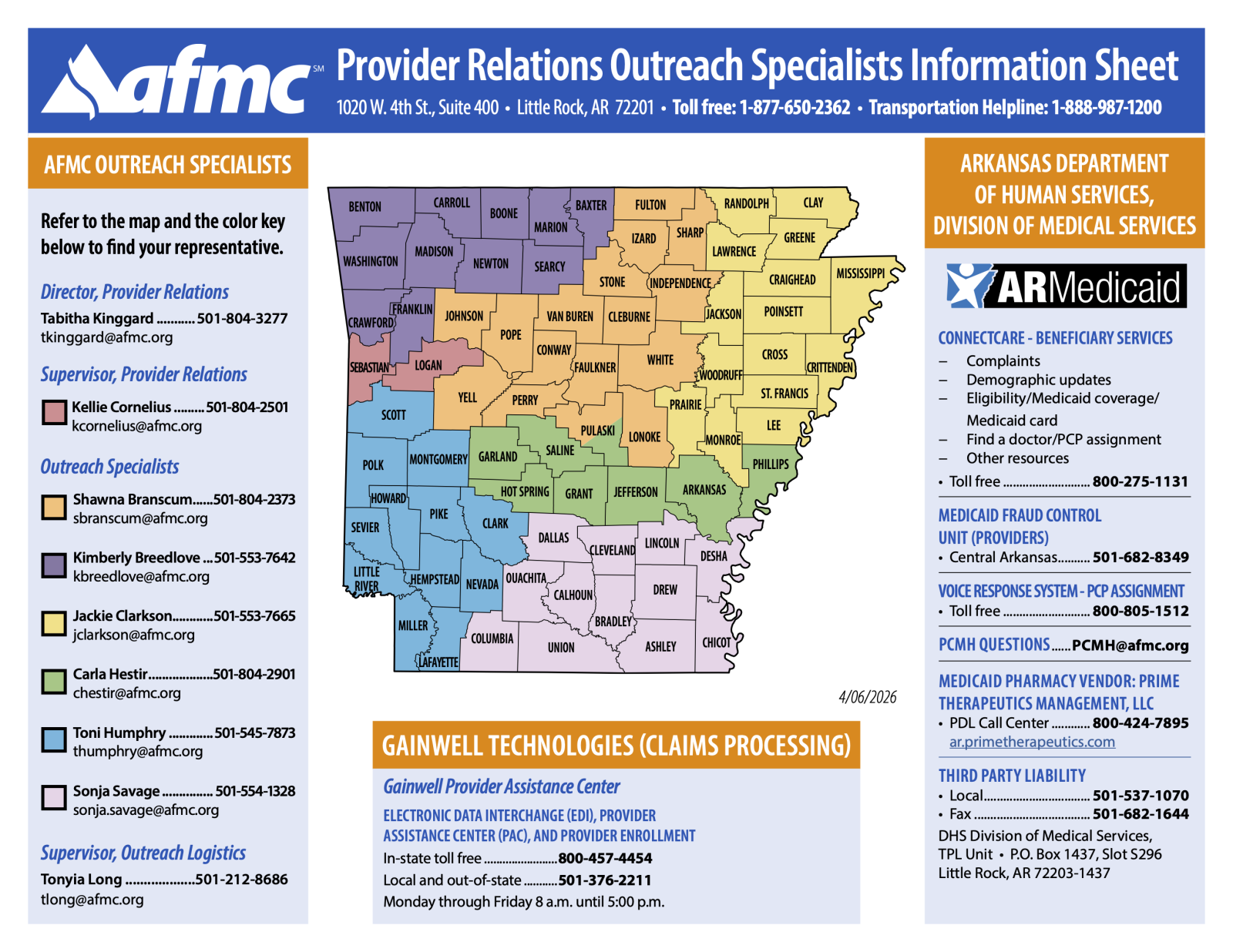 AFMC’s policy and education outreach specialists serve as the link between health care providers and Arkansas Medicaid. We help providers navigate the Medicaid system and stay up-to-date on policies, procedures, and new initiatives. Our team is a diverse group of professionals, each with several years of managerial experience in clinics and hospitals and extensive knowledge of Arkansas Medicaid.